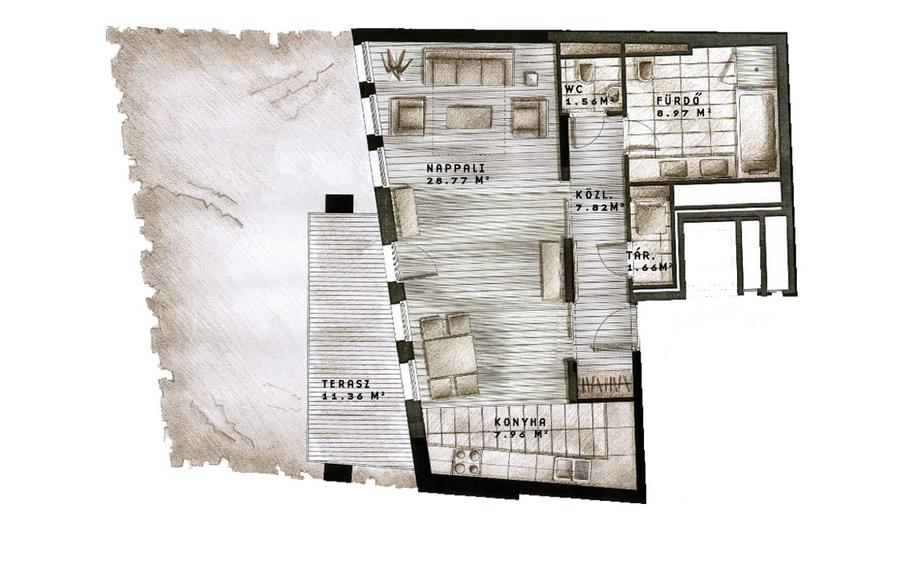 Ez az 56 nm-es 1 hálószoba + amerikai konyhás nappalis lakás egy exkluzív újépítésű komplexumban, luxus minőségben kialakított otthon, mely a földszinten helyezkedik el.