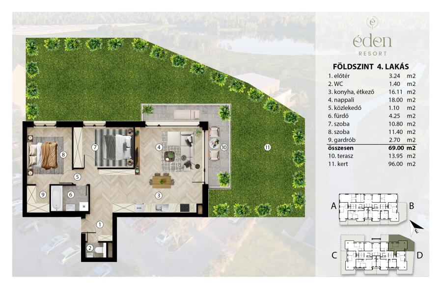 Eladó a már épülő Éden Resortban, Székesfehérvár egyik legszebb zöldövezeti részén, egy 69 m²-es, amerikai konyhás nappali + 2 hálószobás földszinti lakás, amelyhez 14 m²-es terasz és egy tágas, 96 m²-es saját kertrész tartozik.