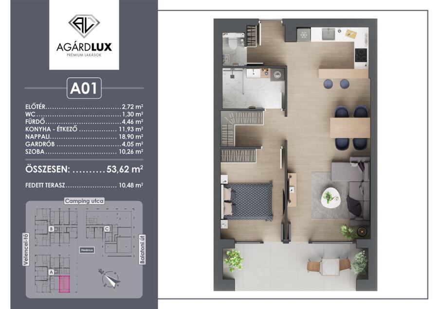 Eladó az Agárd Lux új építésű, prémium társasházban egy 54 m²-es, amerikai konyhás nappali + 1 hálószobás földszinti lakás, amelyhez 10,5 m²-es fedett terasz tartozik. A terasz a belső, zárt udvarra néz, így a lakás csendes és nyugodt.