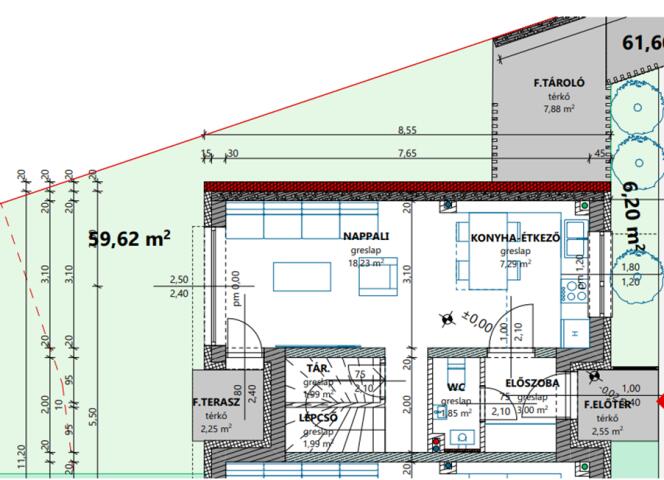 Földszint: tágas előszoba, nappali–konyha–étkező egyben, külön WC, lépcső alatti tároló/mosókonyha, nappaliból közvetlen kijárat a teraszra és a saját, zárt kertre.