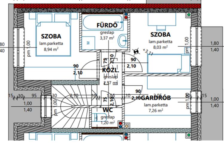 Emelet: 3 db hálószoba, 1 db fürdőszoba, melyben még választható, hogy kádas vagy zuhanyzos megoldás legyen, illetve 1 db WC