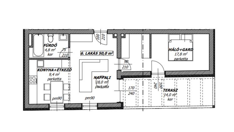 A lakás különlegessége a 14 nm-es, tágas utcára néző terasz, amely ideális reggeli kávézáshoz, növényekhez vagy akár egy kisebb lounge-rész kialakításához.